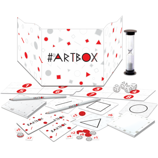 La boîte de #ARTBOX contient des cartes de mots, des dés géométriques, des blocs de dessin, des crayons, et un livret de règles. Tout est conçu pour offrir une expérience de jeu fluide et accessible à tous.