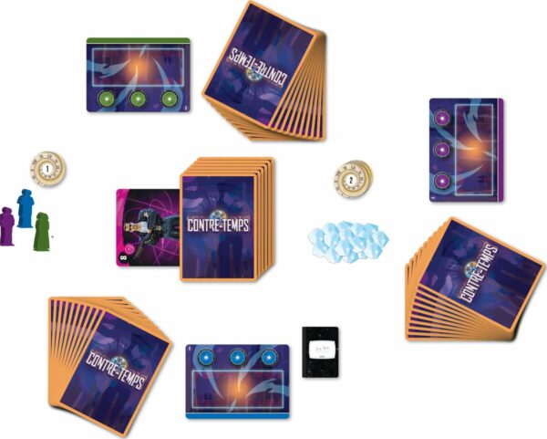 Contre-temps comprend un plateau de jeu illustré, des cartes d’action, des jetons, des pions, et un sablier pour mesurer le temps. Les illustrations détaillées et les composants de haute qualité enrichissent l'expérience de jeu et facilitent l'immersion dans les divers scénarios.