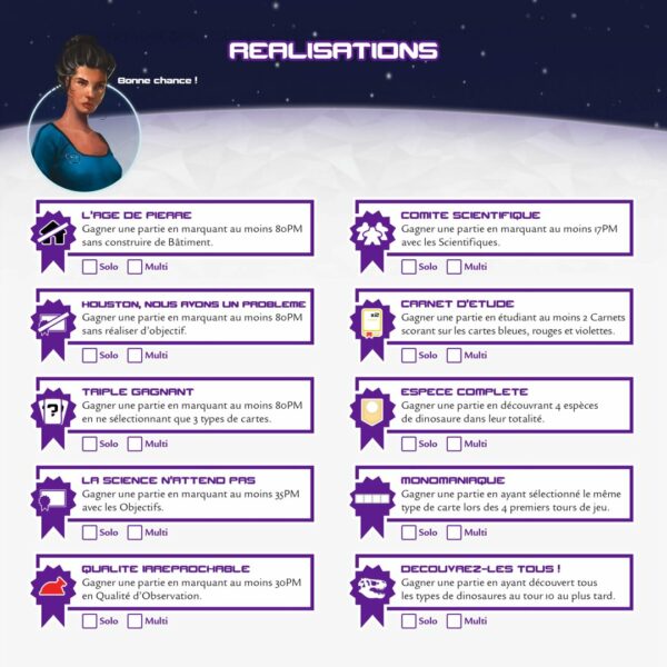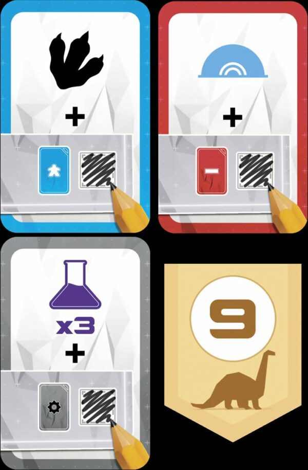 La boîte de jeu contient des cartes d'action, des plateaux individuels, des crayons, ainsi que des fiches de score pour chaque joueur. Le design soigné et les illustrations immersives renforcent l'expérience de jeu, offrant une aventure aussi belle que stimulante.