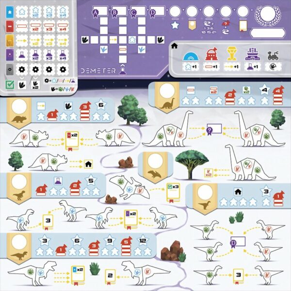 Tout d'abord, Demeter est un jeu de société captivant qui vous transporte dans un univers de science-fiction où vous incarnez des scientifiques en mission sur la planète Demeter 1. Votre objectif ? Explorer cette planète lointaine, étudier ses dinosaures et développer la meilleure colonie scientifique. Par ailleurs, dans ce jeu de stratégie et de gestion, vos décisions auront un impact direct sur le succès de votre mission.