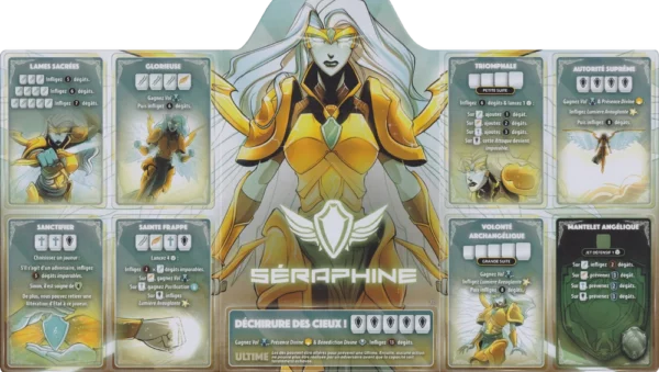 Dans cette boîte de la saison 2 de Dice Throne, la Séraphine et la Reine Vampire s'affrontent dans un duel légendaire où le bien et le mal s'opposent avec férocité. La Séraphine, ange céleste et gardienne de la lumière, utilise ses pouvoirs sacrés pour soigner ses blessures et repousser les forces des ténèbres. Elle peut se protéger des attaques adverses tout en infligeant de puissantes représailles grâce à sa lumière divine. Son style de jeu repose sur l'équilibre entre défense et attaques ciblées, permettant de résister plus longtemps sur le champ de bataille.