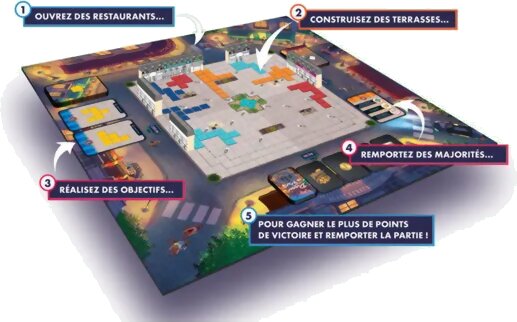Dans ce défi savoureux, vous incarnez un restaurateur prêt à tout pour ouvrir les adresses les plus prestigieuses et séduire touristes comme Parisiens. Ainsi, tour après tour, vous devrez étendre vos terrasses, ouvrir de nouveaux établissements et réaliser des objectifs ambitieux pour asseoir votre renommée. Dès les premiers mouvements, la compétition devient féroce et l’ambiance chaleureuse s’installe autour du plateau.