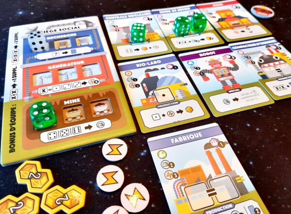 Bienvenue dans le monde effervescent de Fantastiques Fabriques, un jeu de société stratégique et compétitif, où la planification, la construction et la production sont les clés de la réussite industrielle. En combinant gestion de ressources, placement de dés et construction d’usines, affrontez vos adversaires pour devenir le maître incontesté de la productivité !