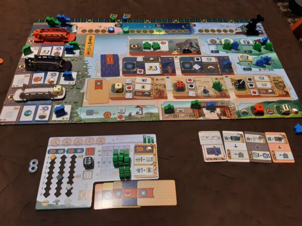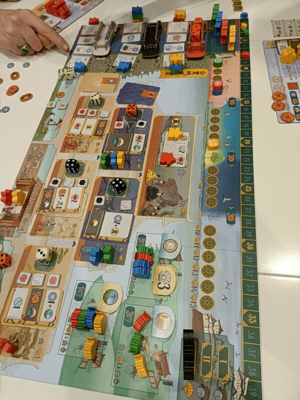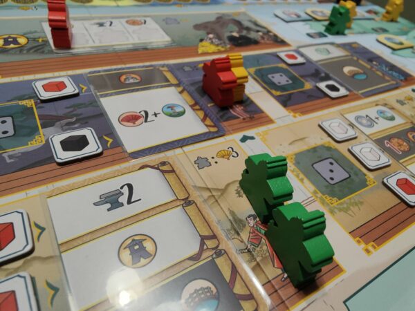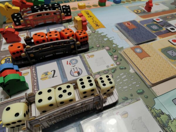 Le panneau central présente le château de Himeji dans toute sa splendeur, divisé en plusieurs zones. La plus grande se trouve à l'intérieur du château, avec la Salle des Mille Tapis, où les courtisans doivent progresser socialement jusqu'à atteindre le cercle le plus proche du Daimio pour jouir de sa faveur. Il y a aussi l'étang et les jardins, patiemment entretenus par les jardiniers, où chacun peut se détendre et contempler leur beauté sans restriction. Une autre zone importante est le mur et l'extérieur du château, où les guerriers patrouillent et montent la garde. Enfin, nous trouvons la zone des trois ponts, où les trois types de dés pouvant être utilisés pour effectuer des actions sont accumulés, ainsi que le domaine personnel de chaque joueur, où ils suivront leurs ressources et auront leur réserve d'ouvriers.
