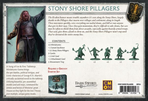La bannière du Kraken, symbole de la Maison Greyjoy, est synonyme d'ennuis le long de la Côte de pierre. Cela est en grande partie dû aux Pillards des Roches, qui infestent les villages et les établissements côtiers. Ces pillards se déplacent rapidement, s'emparant de tout ce qui n'est pas cloué au sol, et ils ne reculent devant rien pour éliminer tous ceux qui croisent leur chemin. Une fois lancés dans l'action, ils deviennent difficiles à arrêter. Cependant, ils doivent être protégés des attaques directes, en particulier de la part de troupes lourdement armées. Donnez-leur un flanc à attaquer, et les Pillards des Roches ne s'arrêteront pas avant d'avoir dévoré toute la ligne ennemie.
