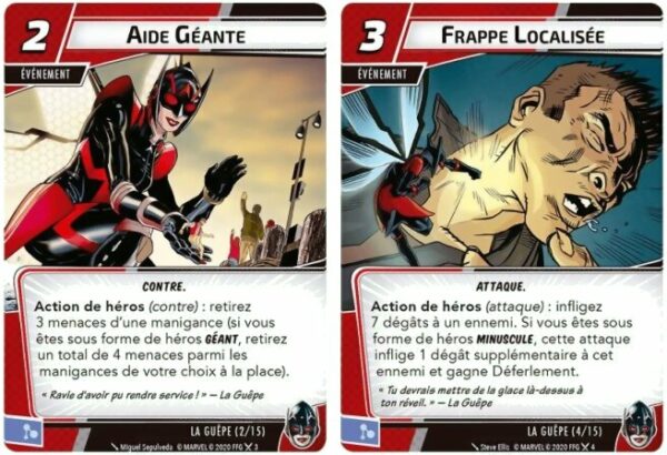 La Guêpe peut se battre sous deux formes différentes : minuscule et géante. En forme minuscule, elle peut infliger des coups précis et causer des dégâts aux méchants. En forme géante, elle peut diviser les dégâts infligés entre différents ennemis, ce qui en fait une alliée redoutable. Ces capacités uniques offrent une diversité stratégique qui enrichit chaque partie.