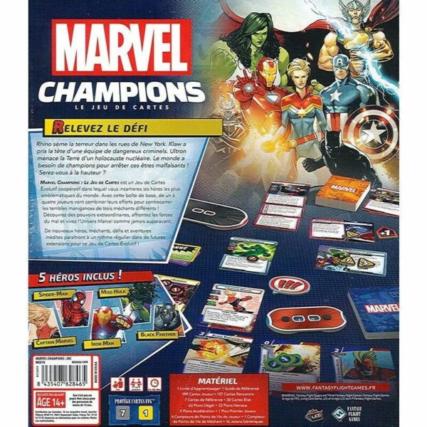 La boîte de base de Marvel Champions JCE vous offre tout le nécessaire pour commencer votre aventure. En effet, avec plus de 350 cartes, 100 pions, cinq compteurs de points de vie et bien d'autres matériels, vous êtes parfaitement équipé. Choisissez parmi Iron Man, Captain Marvel, Spider-Man, Black Panther ou Miss Hulk. Combinez leurs pouvoirs pour contrer les plans des méchants et sauver le monde.