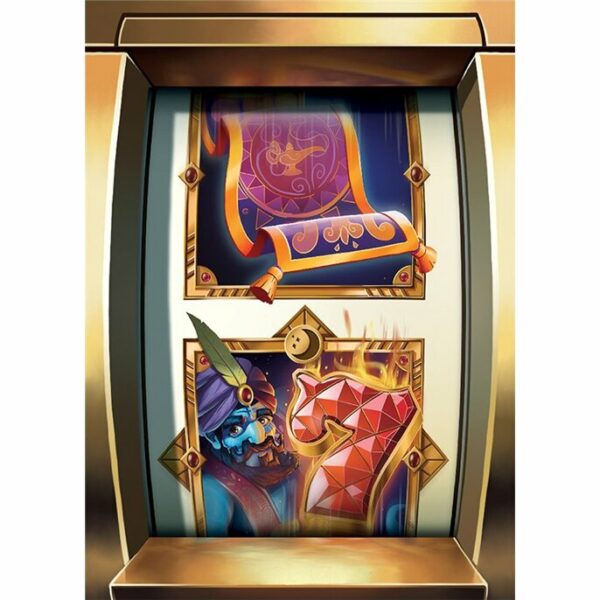 La boîte de Mega Jackpot contient un plateau de jeu illustré représentant une machine à sous, des cartes de jeu, des jetons de casino, des dés spéciaux et un livret de règles. Les composants sont de haute qualité, avec des illustrations vibrantes et des matériaux durables, garantissant une expérience de jeu agréable et immersive.
