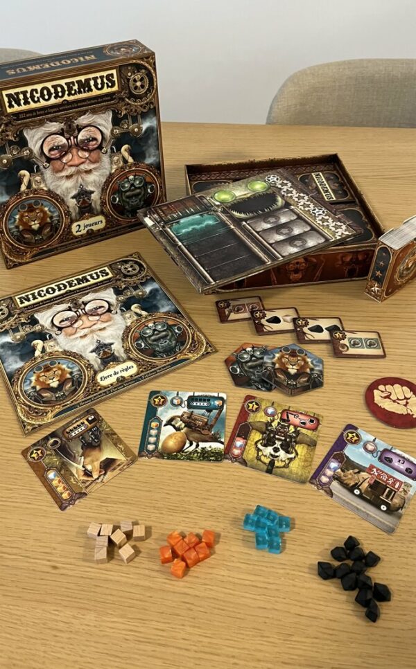 La boîte de Nicodemus contient un plateau de jeu, des cartes de machines illustrées, des jetons de ressources et de points de victoire, ainsi qu'un livret de règles. Les illustrations détaillées et l'univers steampunk ajoutent une touche d'immersion supplémentaire.