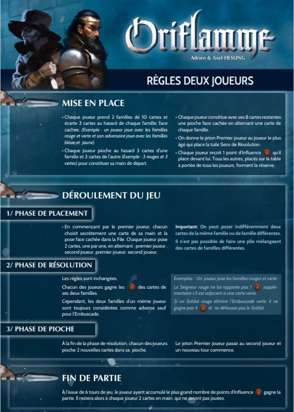 7 € / semainePlongez dans un univers médiéval impitoyable avec le jeu de société Oriflamme. Manipulation, ruse et sang pour accéder au trône. Jouez face cachée, éliminez vos adversaires et remportez la victoire !