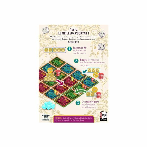 Une touche de jus d'ananas, une goutte de crème de coco, un soupçon de zeste de citron, quelques glaçons, et... SECOUEZ ! Lancez les dés et formez des combinaisons. Bloquez les meilleurs emplacements et marquez des points ou alignez 4 pions pour l'emporter immédiatement !