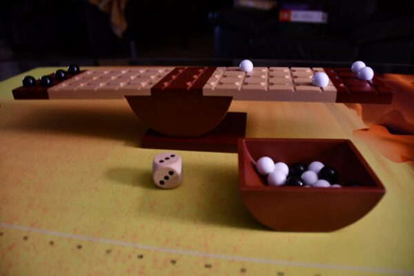 Le jeu se compose d'une planche de bois qui bascule comme une balançoire, d'un dé spécial et de 28 billes. Le but du jeu est d'être le premier joueur à ramasser avec précaution quatre billes à votre extrémité du plateau sans atteindre le point de basculement, ce qui ferait toucher la planche à la table.
