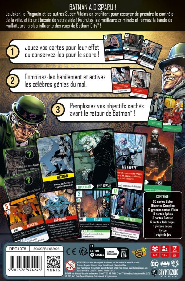 Jouez vos cartes habilement, combinez-les pour activer les célèbres adversaires de Batman, et remplissez vos objectifs cachés avant que le héros de Gotham City ne revienne !