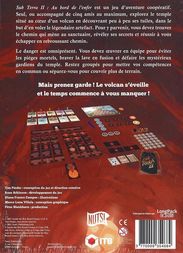 Sub Terra II : Au bord de l'enfer est un jeu de plateau coopératif, intense et stratégique, qui transporte 1 à 6 joueurs dans une aventure palpitante. Vous et votre équipe de courageux explorateurs devez infiltrer un temple volcanique oublié pour récupérer un artefact sacré. Tout en évitant les dangers mortels qui y rôdent. Situé dans le cœur d'un volcan en activité, ce temple regorge de pièges anciens.