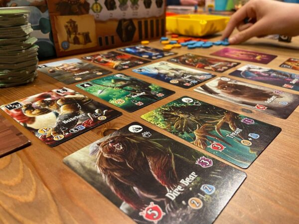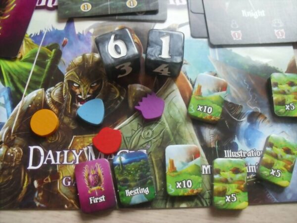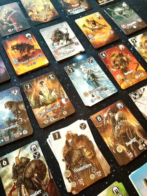Par ailleurs, le jeu se déroule en plusieurs tours où les joueurs lancent des dés pour générer des ressources, représentées par des symboles sur les cartes de citoyens. À chaque tour, vous pouvez choisir de recruter de nouveaux citoyens, construire des bâtiments qui vous octroient des bonus permanents ou engager des combats contre des monstres pour gagner des récompenses précieuses. La gestion de vos ressources est cruciale : or, magie et force militaire doivent être utilisés judicieusement pour maximiser vos points de victoire.