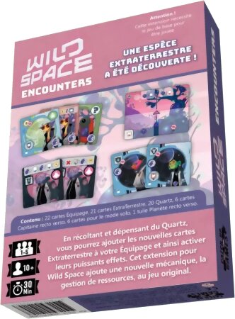 Wild Space + Encounters est prévu pour 1 à 5 joueurs, à partir de 10 ans, pour des parties d’environ 30 à 45 minutes.